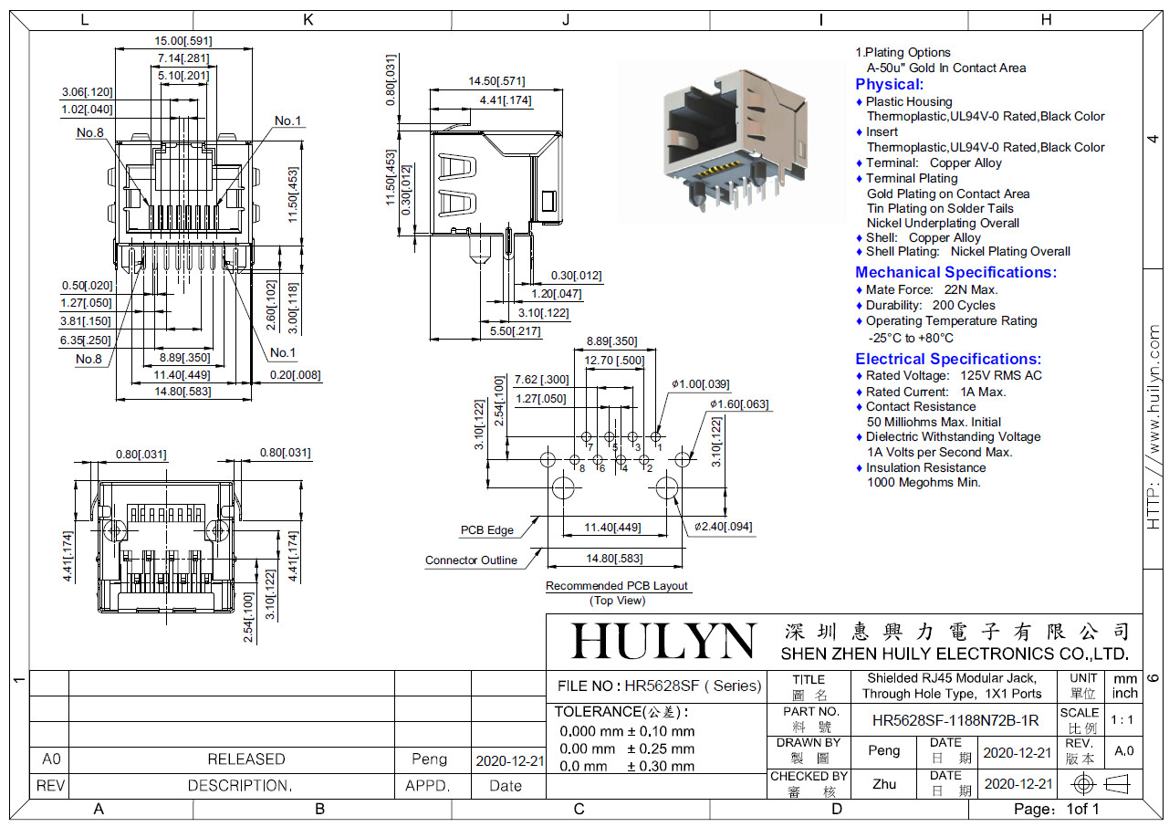 HULYN,New product , high-speed RJ45 connector/CAT5E/1G/THT/H11.5MM